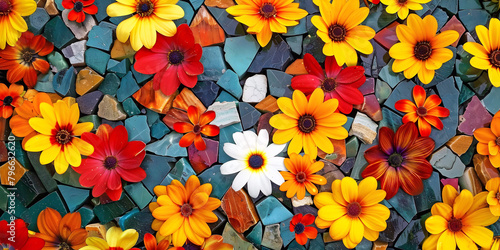 mosaic, floral, pattern, flower, flower, yellow, orange, plant, beauty, spring, bouquet, daisy, flora, marigold, blossom, colourful, bright, bloom, beautiful, red, bunch, colours, daisy, image, made, small, regular, irregular, piece, coloured, stone, glasses, ceramic, in plaster, covering, surface, floor, wall, decoration, artwork, construction, ai, generated, wallpaper, illustration, garden
