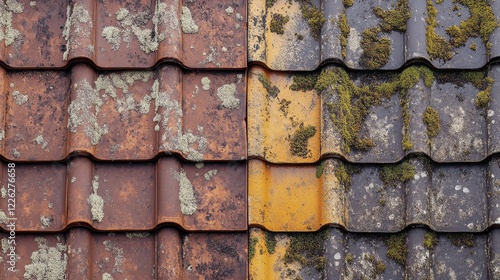 roof, tile, moss, lichen, aged, weathered, texture, background, grunge, dirty, before, after, restoration, renovation, building, construction, house, home, property, real estate, exterior, surface, pattern, detail, old, vintage, rustic, decay, damage, deterioration, growth, nature, environment, ecology, fungal, algae, maintenance, inspection, problem, solution, improvement, contrast, comparison