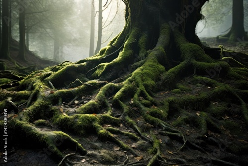 Moss-covered tree roots winding through a damp forest floor, bathed in soft, diffused light