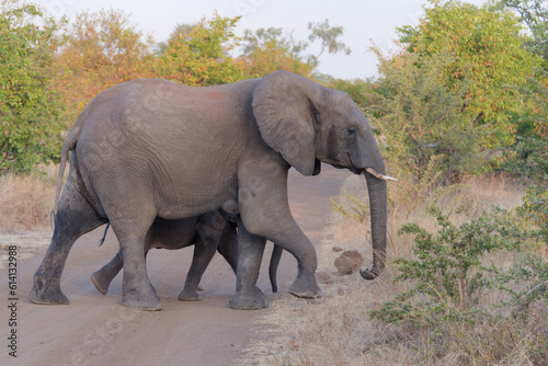 Mother and baby elephant walking across the path in Zambezi National Park, Zimbabwe
