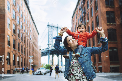 Mother and baby in Brooklyn with Manhattan Bridge in background, NYC, USA