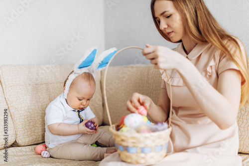 Mother and baby with rabbit ears, with Easter eggs in a basket, parents and children play indoors. Family celebrates Easter,