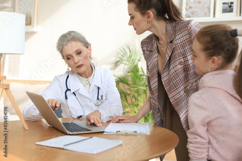 Mother and child in the doctor office meeting the pediatrician, they are sitting at desk in hospital.