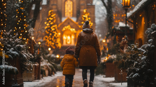 Mother and child walking through festive winter wonderland at night