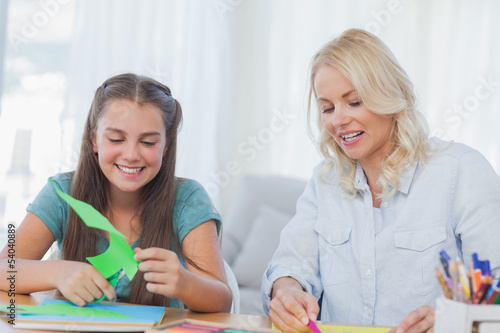 30s, woman, female, caucasian, children, girl, indoor, brown hair, blond, long hair, cute, home, house, sitting, table, desk, paper, crayons, mother, father, daughter, couch, sofa, living room, arts and crafts, drawing, ruler, colouring, holding, scissors, happy, smiling, cheerful, talking, communication, conversation, interact, speaking, discussion