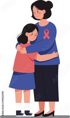 mother, daughter, hug, hugs, support, care, family, love, breast cancer, awareness, ribbon, pink, blue, sweater, clothing, standing, shoe, hair, black hair, skin, health, disease, disease, hope, comfort, vector, illustration, female, children, adult, together, people, human relationships, affection, emotion, charity, help, solidarity, fight, survivor, community, symbol, signs, oneness, empowerment, kindness, compassion