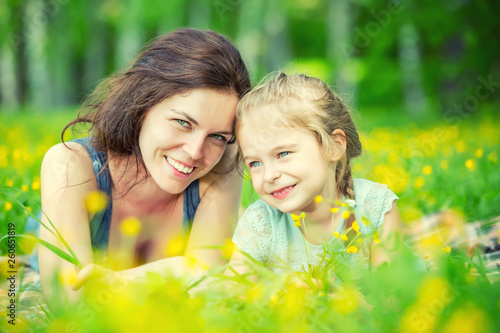 Mother and daughter lying on green summer meadow with blooming yellow flowers