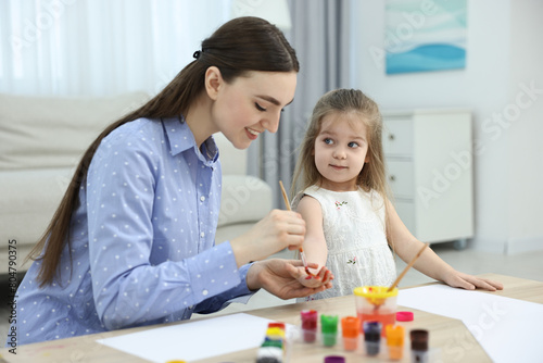 Mother and her little daughter painting with palms at home