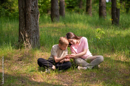 mother and son are sitting side by side in a forest clearing and looking at something in their palms