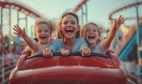 Mother and two children family riding a rollercoaster at an amusement park experiencing excitement, joy, laughter, and fun, Generative AI