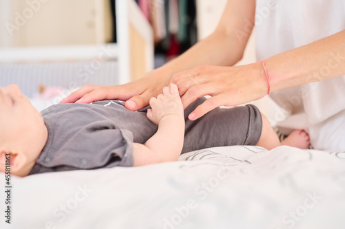 Mother calming baby with hands.