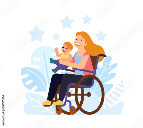 Mother disability holding child in arms. Happy disabled mom hugging baby. Paralyzed parent with kid. Female in wheelchair. Handicapped people inclusive accessibility. Vector concept