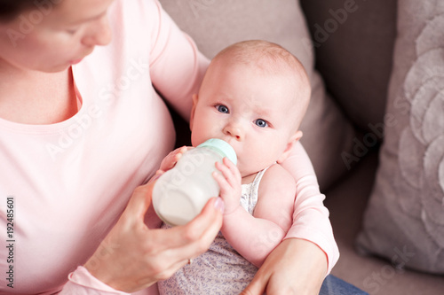 Mother feeding baby in room. Infant holding drinking milk from bottle closeup. Looking at camera. Healthy nutrition.