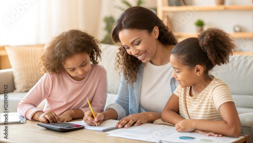 Mother helping her children with homework at home, promoting family bonding and education