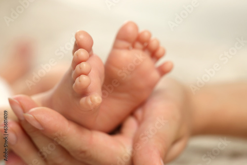 Mother holding her newborn baby, closeup view on feet. Lovely family