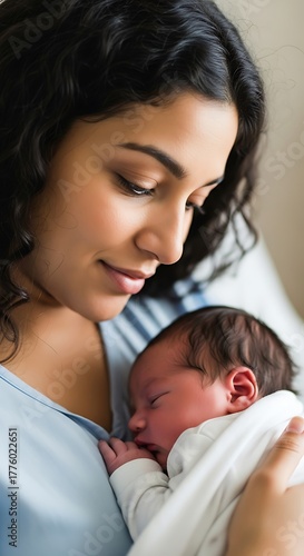 mother, baby, newborn, sleeping, holding, hugs, love, care, tenderness, family, bonding, intimacy, peaceful, calm, gentle, soft, light, blue, white, skin, hair, eye, closeup, portrait, human