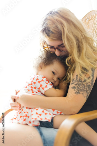 vertical, indoor, day, half face, embracing, sitting, dress, casual clothes, brown hair, long hair, straight hair, curly hair, eyeglass, two people, mother, daughter, family, chair, care, togetherness, tattoo