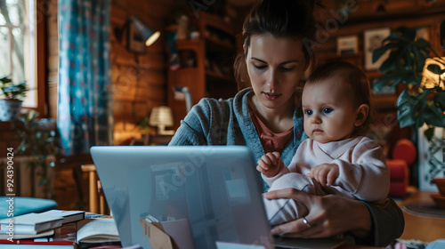 Mother with small baby working from homeoffice, typing on laptop. Mom paying bills online, holding small baby.