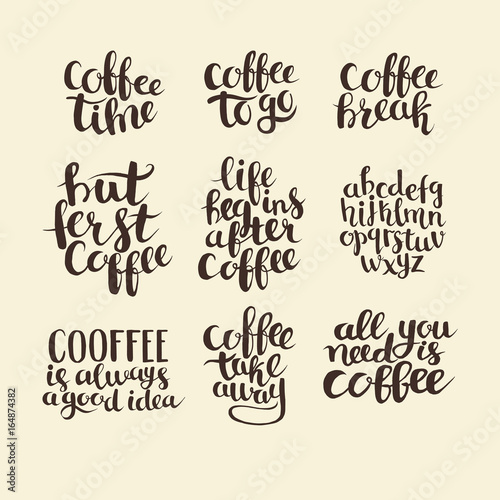 Motivation quote about the coffee collection. Hand draw lettering cards. Vintage posters. Decoration for coffee shop. Isolated on white background