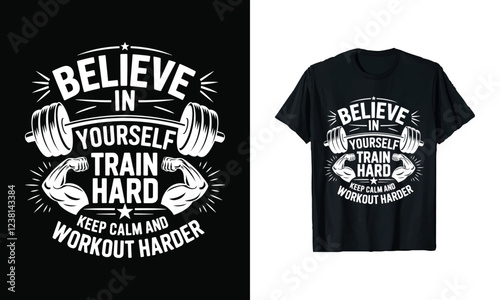 Motivational Fitness T-Shirt Design - 'Believe in Yourself, Train Hard' Graphic Tee Ideal for Athletes and Gym Enthusiasts. Perfect for Staying Inspired and Committed to Your Workout Goals!