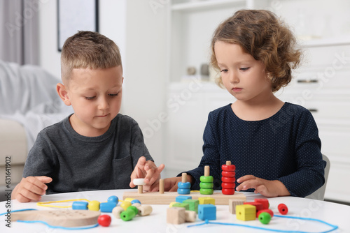 Motor skills development. Little kids playing with stacking and counting game at table indoors