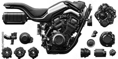 engine, motor, vehicle, machine, part, metal, steel, chrome, design, mechanical, automotive, transport, equipment, system, component, cylinder, structure, industry, power, technology, object, isolated, shiny, detail, complex, assembly, illustration, rendering, element, transparent, white, detailed, motorcycle, component
