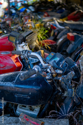 abandoned, closeup, copy space, countryside, day, grass, motorcycle, outdoors, rural, sunlight, vegetation, vehicle