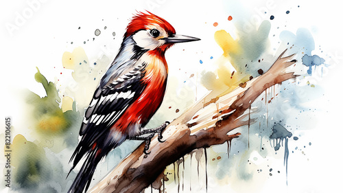 woodpecker, bird, feather, watercolor, mottled, animal, nature, wildlife, white, wild, beak, spotted, isolated, black, red, tree, wing, illustration, colourful, ornithology, fauna, cute, natural, background, drawing, art, colours, fly, flying, painting, birding, graphic, character, design, paint, abstract, zoo, head, cut-out, portrait, artwork, biology, creature, eco, print, textile, banner, sticker, cut-out