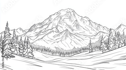 Mount Rainier National Park Line Art Drawing - Majestic mountain range, snow-covered peaks, evergreen forest, serene landscape, winter wonderland. Symbolizing peace, nature, adventure, beauty, escape
