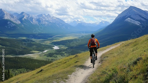 Mountain biker descends scenic valley trail.