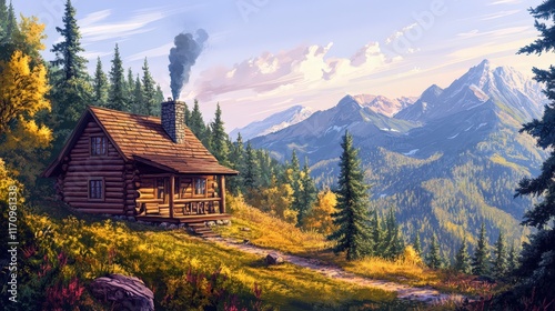 cabin, log, wood, house, home, mountain, mountain, range, forest, wood, tree, pine, autumn, fall, foliage, leaf, yellow, gold, orange, red, green, sky, cloud, sun, light, smoke, chimney, stone, path, trail, hill, vale, landscape, scenic, nature, wilderness, rural, remote, tranquil, peaceful, serene, picturesque, majestic, breathtaking, beautiful, vibrant, colourful