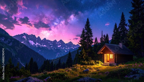 mountain, cabin, night, sky, star, milky way, cloud, twilight, vale, forest, tree, light, wood, house, nature, landscape, evening, sunset, sunrise, alpine, peak, mountain, rocky, grass, flower, peaceful, tranquil, gorgeous, scenic, beautiful, idylli, dreamlike, wonder, astronomy, cosmic, galaxy, glowing, illuminated, exterior, charming, rustic, wooden, view, marvellously, amazing, breathtaking, exploration, adventure