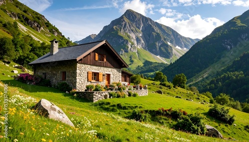 stone house, mountain landscape, alpine meadow, flower, grass, mountain, vale, nature, scenic, rural, countryside, summer, travel, vacation, home, architecture, tranquil