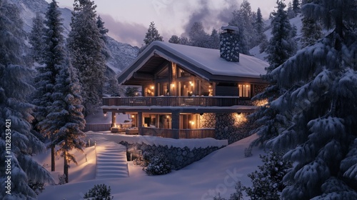 Mountain chalet with snow-covered deck, frosty pine trees, peaceful winter twilight
