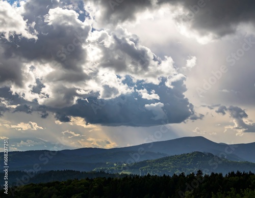 mountain, cloud, sky, landscape, panorama, storm, cloudscape, nature, scenic, view, forest, dramatic, sunlight, weather, hill, vale, dark, light