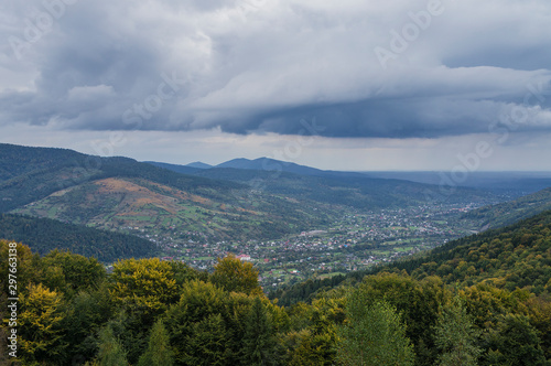 Mountain forest green landscape with houses and a far village.