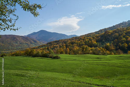 autumn, colourful, mountain, forest, tree, meadow, grazing, cow, beautiful, nature, natural, landscape, fall, green, background, season, land, grass, yellow, blue, environment, countryside, summer, animal, farmland, vale, october, sky, mammal