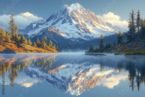 mountain lake mirror at dawn, snow-capped peaks, pristine reflection, golden morning light, evergreen forest