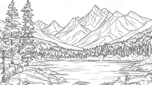 mountain, lake, nature, landscape, serene, colouring, page, forest, tree, water, mountain, peak, hill, wood, calm, peaceful, quiet, scenic, view, wilderness, tranquil, majestic, beauty, summer, spring, travel, adventure, exploration, relaxation, escape, freedom, inspiration, art, drawing, illustration, graphic, design, image, picture, photo, stock