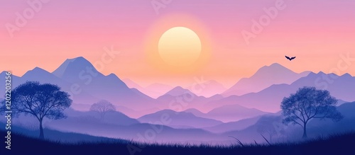 Mountain landscape during sunset with purple and orange hues and minimalistic trees, providing ample copy space.