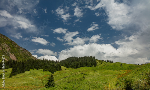landscape, sky, grass, nature, field, green, mountain, summer, meadow, cloud, hill, cloud, tree, countryside, rural, view, forest, mountain, blue, scene, panorama, land, vale, horizon, spring