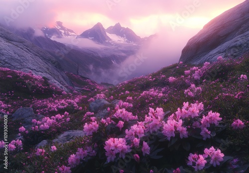 Mountain Landscape with Rhododendron Flowers at Sunset, AI generated illustration