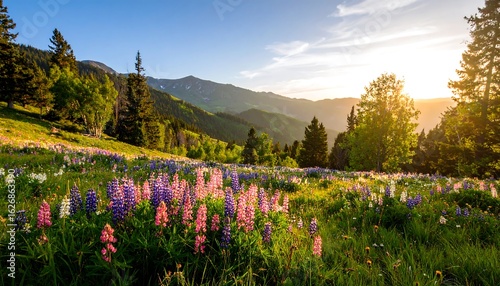 meadow, sunset, mountain, flower, wildflower, vibrant, colours, spring, summer, scenic, landscape, nature, idylli, peaceful, lush, green, hill, vale, tree, alpine, blooming, pastel, gold, light, sky, beauty, beautiful