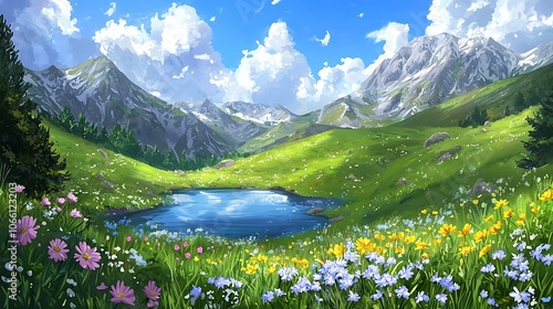 mountain, meadow, duck pond, lake, wildflower, flower, green, grass, blue skies, cloud, nature, landscape, summer, spring, scenic, peaceful, tranquil, beauty, environment, travel, photo, art, illustration, digital artwork