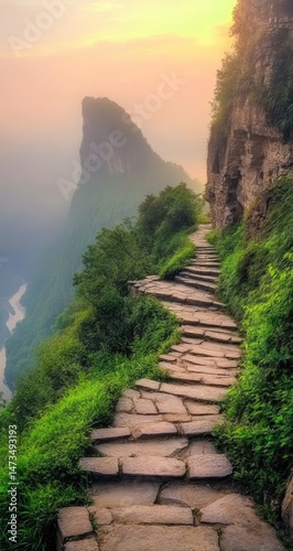 mountain, path, sunrise, step, stone, nature, scenic, landscape, travel, adventure, hiking, view, vale, fog, mist, peak, climb, journey, green, vegetation, forest, rock, stone, calm, peaceful, tranquil, beauty, light, explore, vista, wonder, serenity, elevation, destination, wonders, stunning