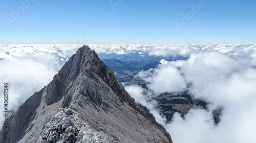 Mountain peak above cloudscape, alpine landscape, scenic view, travel photography