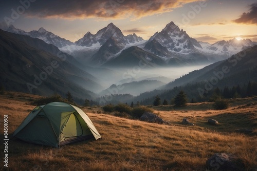 Mountain Peak Vista: An awe-inspiring panorama of a mountain peak viewed from a campsite nestled in the valley below.