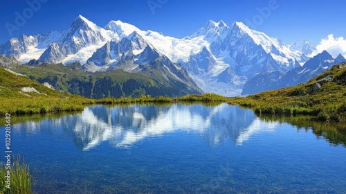 mountain, range, water, still, lake, duck pond, blue, sky, clear, calm, peaceful, serene, tranquil, majestic, grandeur, nature, landscape, scenic, beautiful, picturesque, vibrant, bright, high-coloured, summer, green, foliage, vegetation, distant, horizon, huge, expansive, wilderness, alpine, summit, peak, glacier, snow, ice, glacé