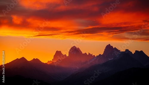 mountain range silhouetted against a vivid orange sunset sky with stylized clouds
