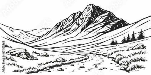 mountain, range, vector, illustration, linear, drawing, ink, black, white, hill, travel, cartography, design, etching, rock, relief, landscape, peak, contour, graphic, vignetting, artwork, engraving, terrain, nature, outline, scenery, wild, alpine, summit, creative, abstract, decorative, map, detailed, textured, geology, slope, wander, adventure, horizon, hand-made, craft, vintage, artistic, topography, minimal
